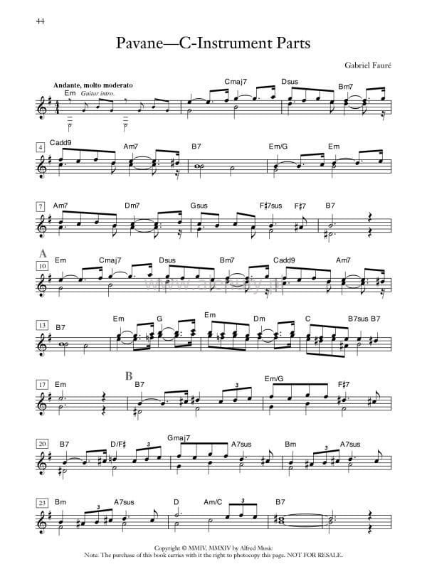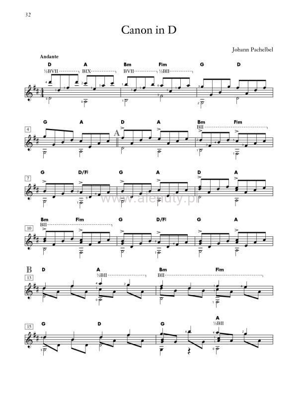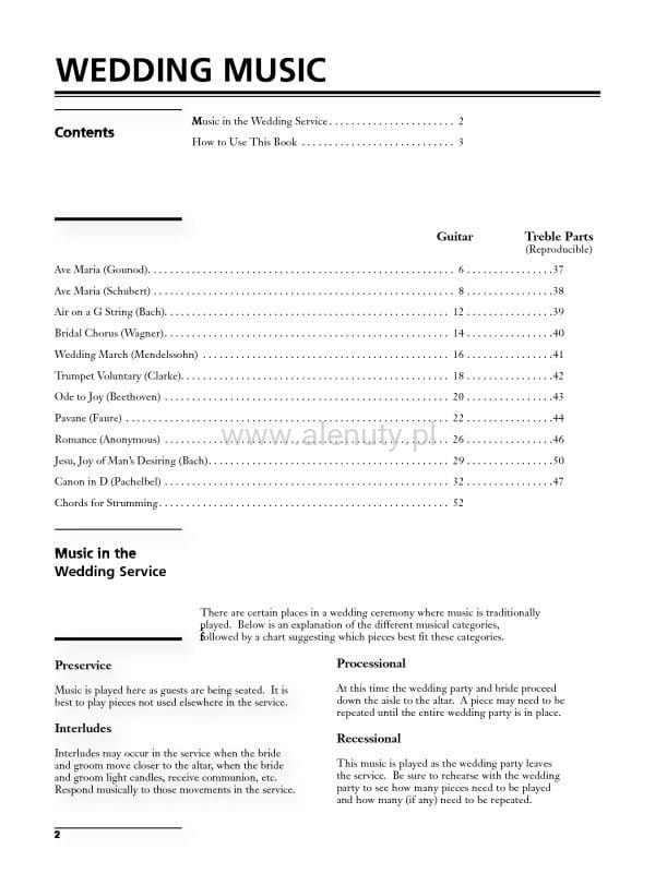 Książka zawiera kolekcję klasycznych utworów idealnych na każde wesele, imprezę lub spotkanie towarzyskie. Ta edycja może być używana przez gitarzystę solowego, duet gitarowy lub mieszany zespół z dwoma instrumentami C. Zawiera klasyki, takie jak "Marsz weselny" Mendelssohna, "Chór ślubny" Wagnera i słynny "Canon in D." Pachelbel. Dzięki partii wysokich tonów, możesz wykonać kopie dla innych instrumentów. Nuty na gitarę klasyczną, dla średnio-zaawansowanych.