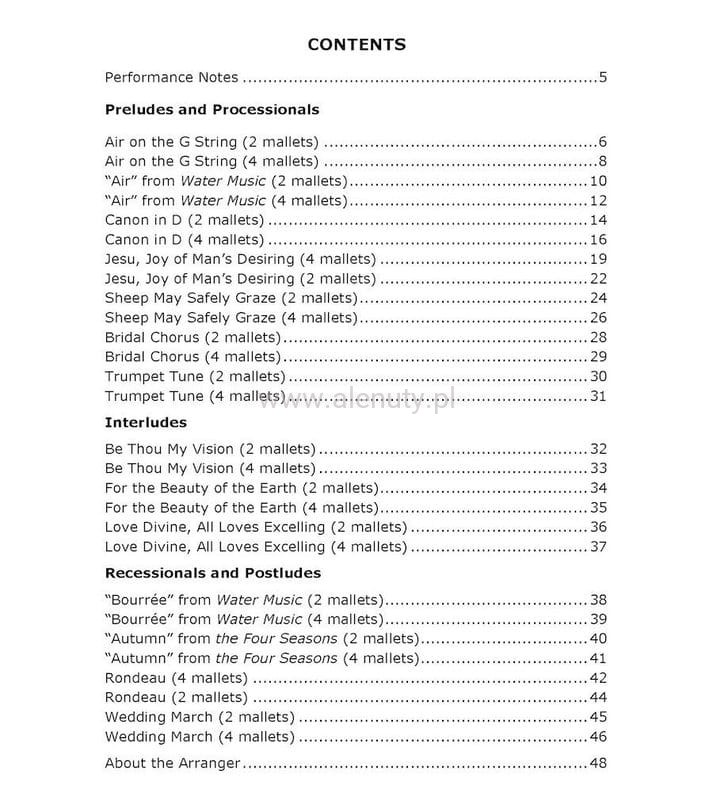 Kolekcja najpopularniejszych dzieł, które zwykle wykonywane są na weselach. Każda kompozycja została zaaranżowana dla dwóch i dla czterech młotków. Układy z czterema młotkami można odtwarzać na marimbie o niskim 4 i 1/3 oktawy. Układy z dwoma młotkami można odtwarzać na marimbie, wibrafonie lub ksylofonie.