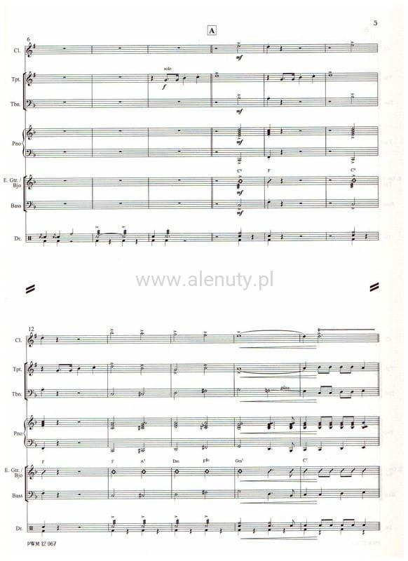Zawiera partyturę oraz nuty na fortepian, klarnet, saksofon tenorowy, trąbkę, puzon, gitarę elektryczną i basową, perkusję. Polecamy szczególnie do pracy z młodzieżą w szkolnych zespołach muzycznych (szkoła muzyczna II stopnia).