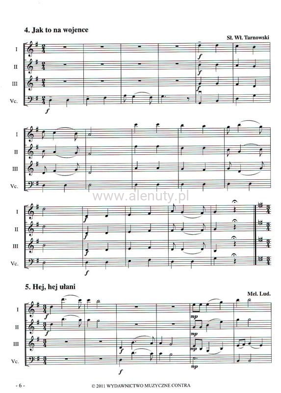 Kolekcja 9 pieśni patriotycznych w opracowaniu J. Rzepeckiej na uczniowski kwartet smyczkowy (troje skrzypiec i wiolonczelę).