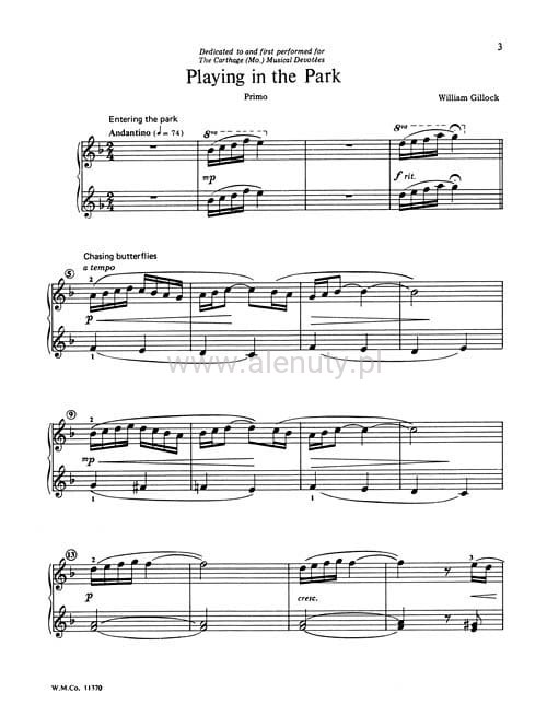 Nuty na fortepian na cztery ręce dość prostego utworu William'a Gillock'a 'Playing in the Park'. Jest to utwór opowiadający o pobycie w parku, pobudzający wyobraźnię, mający takie części jak wejście do parku, gonienie motyli czy karmienie kaczek. Autor utworu, William Gillock, jest XX-wiecznym kompozytorem, znanym głównie z rożnorodnych kompozycji dla uczniów w różnym wieku.