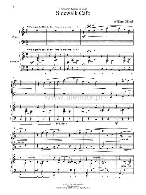 Nuty na fortepian (cztery ręce) utworu Williama Gillocka 'Sidewalk Cafe'. Jest to dość prosty utwór o charakterze rozrywkowym, odprężającym, miejscami ciekawy harmonicznie, z wieloma okazjami do ekpresyjnej gry.