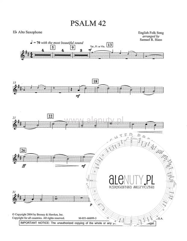 Nuty na młodzieżową orkiestrę dętą czteroczęściowego psalmu 42, jednego z tradycyjnych angielskich utworóœ chóralnych, w opracowaniu Samuela R. Hazo. Oprócz walorów dźwiękowych, utwór ten nadaje się doskonale do celów dydaktycznych. Zawiera partyturę oraz partie każdego instrumentu.