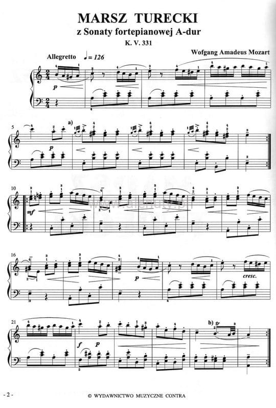 Nuty na fortepian do utworu Wolfganga Amadeusa Mozarta - Marsz turecki (Rondo Alla Turca) – to III część XI Sonaty fortepianowej tego kompozytora. Został skomponowany w tonacji a-moll około 1783 roku w Wiedniu na fortepian solo w formie ronda. Publikacja zawiera nuty dla zaawansowanych.