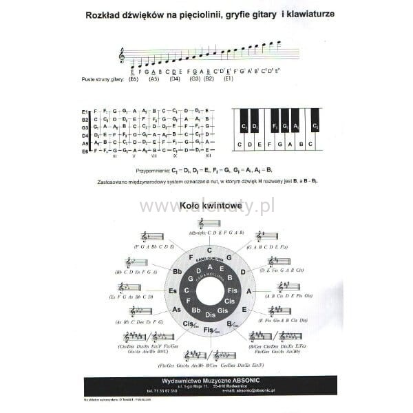 Zeszyt nutowy A4, 32-kartkowy w wąską pięciolinię. Zeszyt pionowy, na stronie znajduje się 14 pięciolini.Na wewnętrznej stronie okładki, rozrysowano koło kwintowe i rozkład dźwięków na pięciolini, gryfie gitar i klawiaturze fortepianowej.