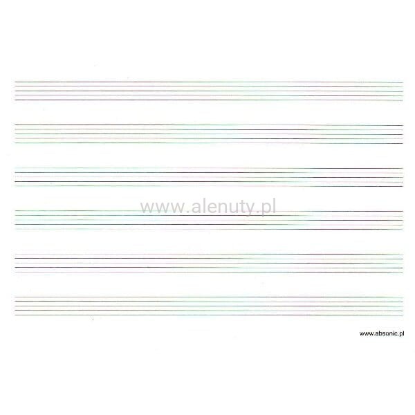 Zeszyt nutowy A5, 16-kartkowy w średnią pięciolinię. Zeszyt poziomy, na stronie znajduje się 6 pięciolinii. Na wewnętrznej stronie okładki, rozrysowano rozkład dźwięków na pięciolinii i klawiaturze fortepianowej.