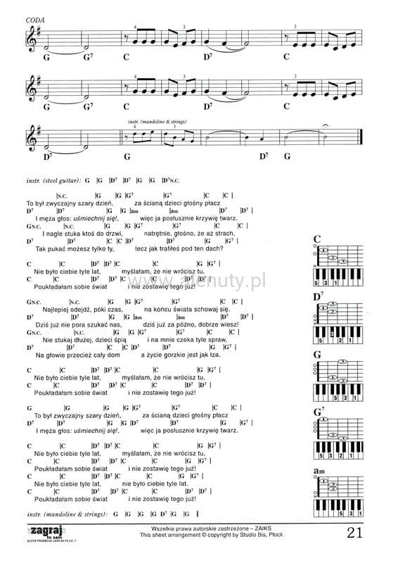 Notacja muzyczna: zapis nutowy, akordy z diagramami klawiszowymi i gitarowymi